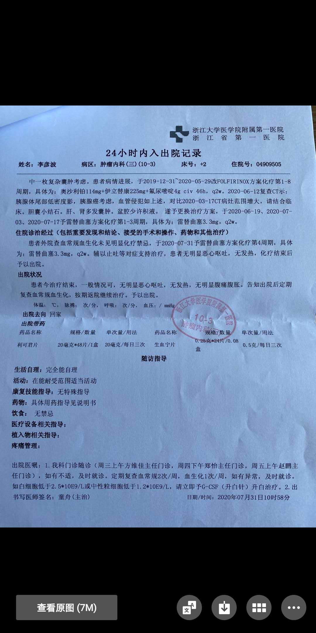 ?? 我的父亲李彦波,今年56岁。2019.6月父亲因为肚子涨吃不下东西,晚上也因为腰背疼痛的整夜睡不着,拖了两个月突然暴瘦20斤,不得已才去家乡医院检查,因为老家医疗条件有限,转到了浙江大学附属第一医院,2019年8月,经过穿刺活检之后,父亲被确诊是癌中之王-胰腺癌!但因为来医院的时间太晚,癌细胞已经扩散不能手术,随后在浙江大学附属第一医院接受药物化疗。