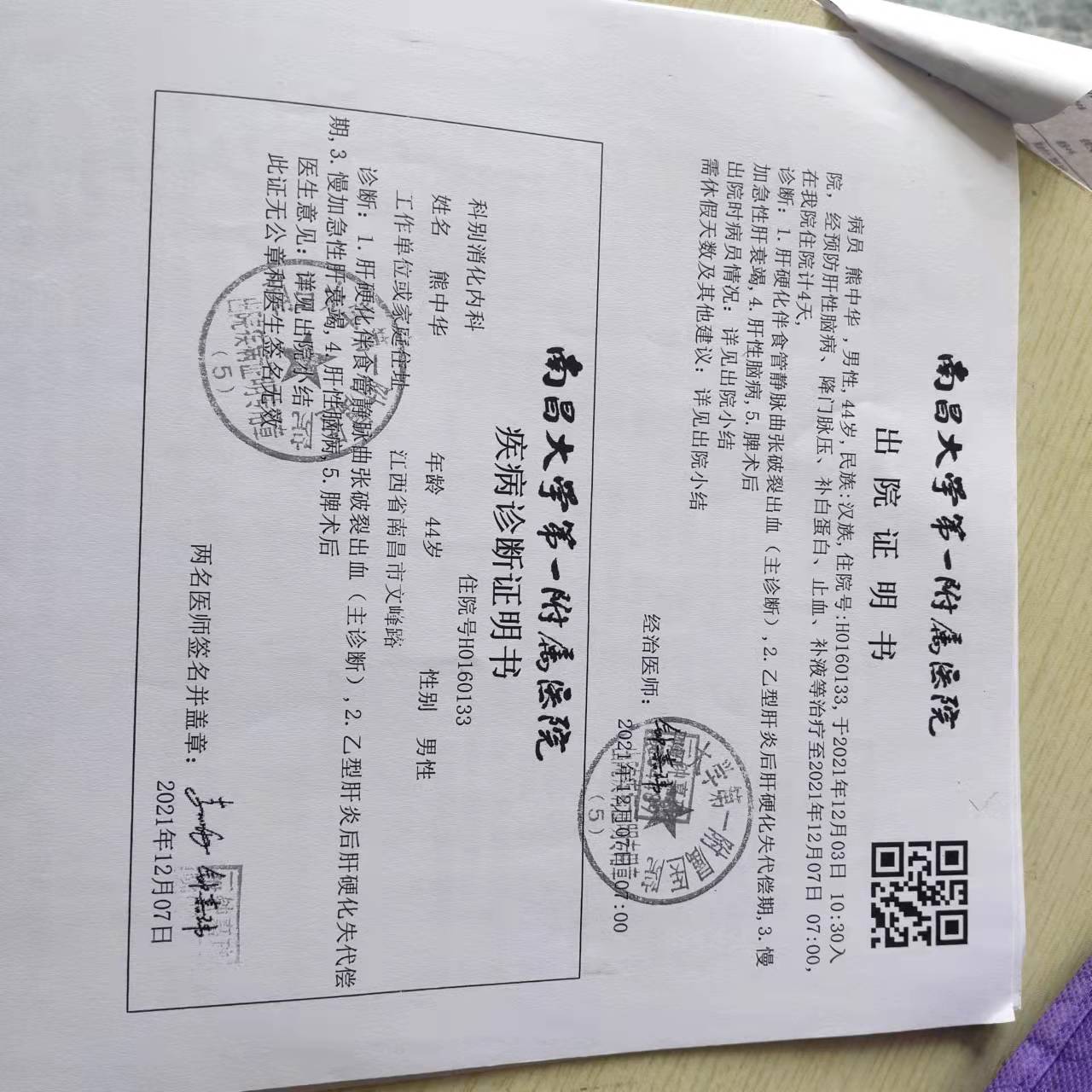 ????????2021年12月,眼瞅着快过年了,我想为全家人的生计和过个好年,不顾自己身体不适,做点零星活。12月23日晚,加班抢进度的他因劳累过度导致吐血昏迷,120急救车送到南昌大学一附医院,经一天一夜抢救,又捡回了一条命,但病情更为严重了。主治医生郑重地告诉我家属:熊中华病情很严重,患有肝硬化伴食管静脉曲张破裂出血、乙型肝炎后肝硬化失代偿期,肝性脑病,慢性加急性肝衰竭,脾脏切除时候等多种重病,患病多年能活到现在已经是个奇迹了,目前生存下去的唯一希望是抓紧做肝移植手术。面对至少50万的手术费和后期每月近3万元的抗排斥药物费,年迈的父母哭着晕厥过去,孩子们又一次抱头痛哭,陷入深深的无助之中。母亲更是求着医生把她的肝给儿子,接受不了白发人送黑发人的悲剧。
