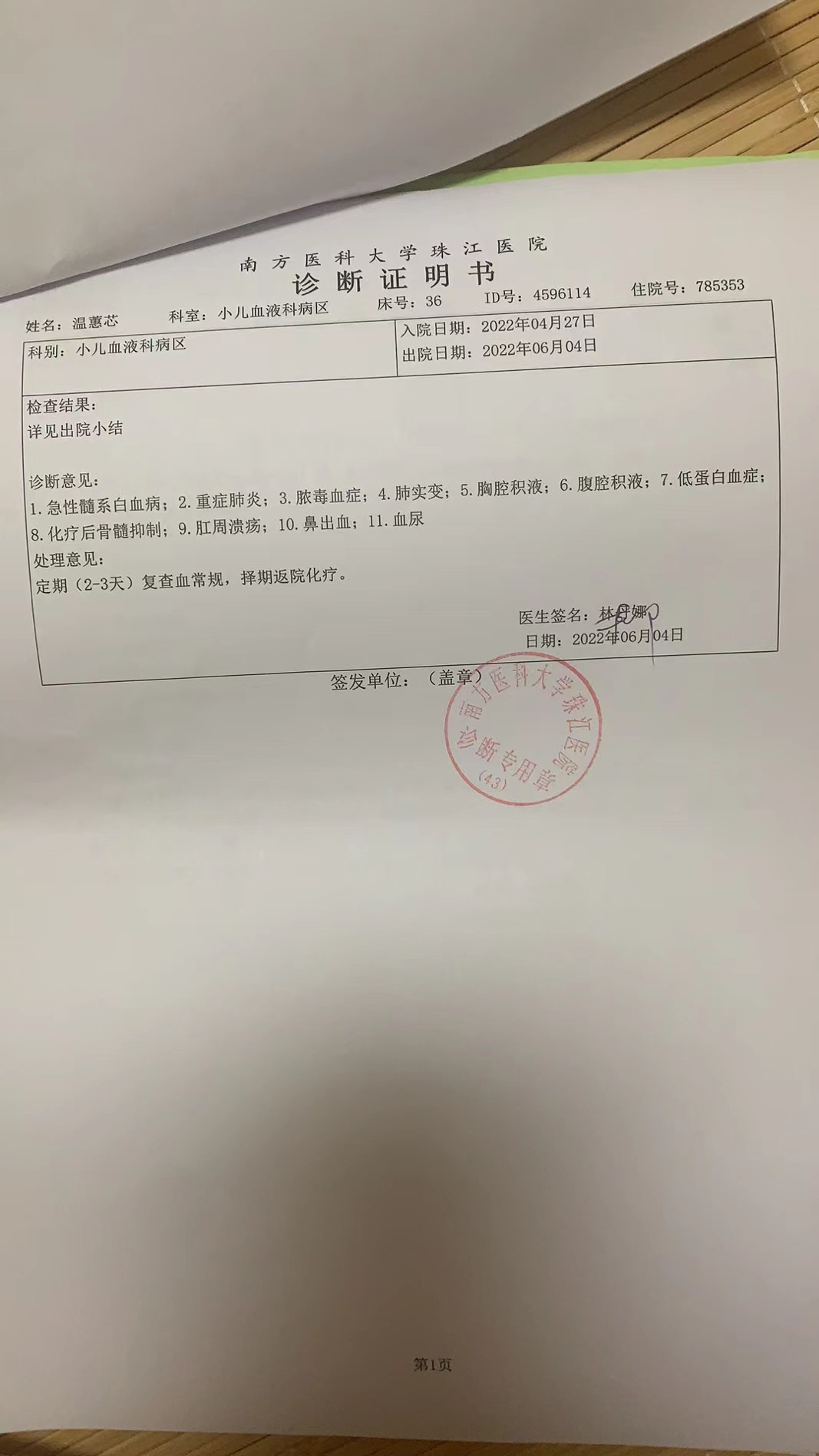 2022年4月15日11岁孩子确诊急性髓系白血,在本地治疗半月不见好转,踏上广州求医,经过化学治疗缓解,医生建议造血干细胞移植,前期治疗花费几十万了,后期移植费用无法估计,对于我们这种普通家庭,根本无法承担,希望得到救助!