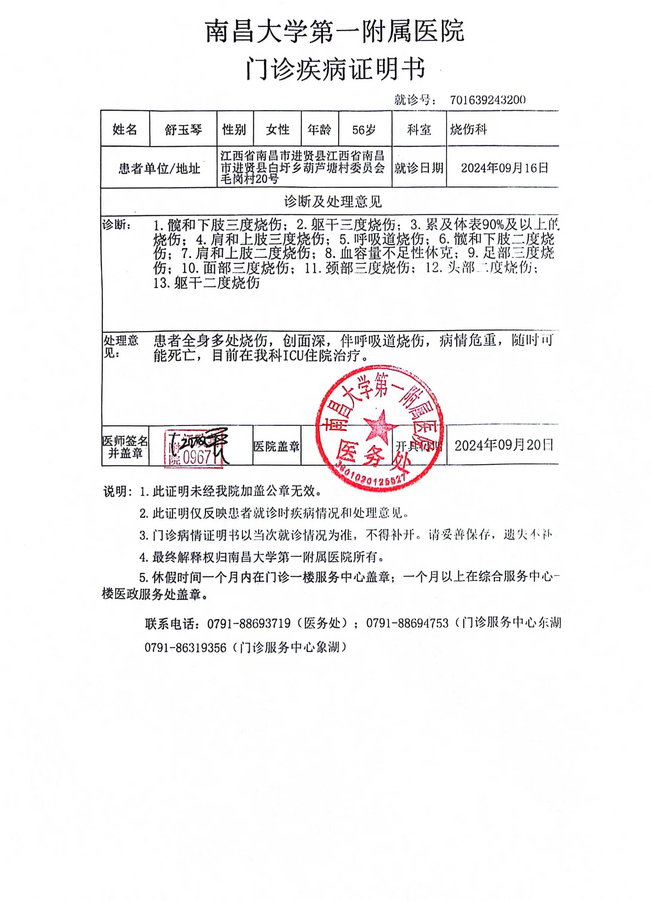 ?? 2024年9月15日晚上10点左右发生,晚上11点我们接到邻居电话,母亲不幸导致严重烧,当我们赶到南昌大学第一附属医院!发现母亲已经面目全非,非常惨重!听亲戚说明情况,母亲是由于楼下着火,母亲本能的往楼下逃生,由于吸入烟尘呛到,滚下楼梯导致特重度烧伤!体表95%特重度烧伤。烧伤深度达到三度以上。属于特重度烧伤!