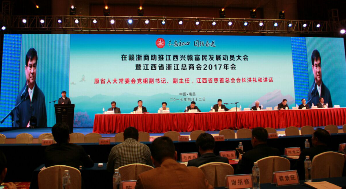 4月12日,在赣浙商助推江西兴赣富民发展动员大会暨江西省浙江总商会2017年会在南昌召开。省慈善总会会长洪礼和,常务副会长刘金接,副会长朱和平出席会议。
