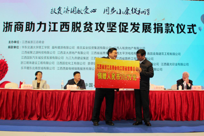 会上陈志胜会长作为代表,在赣浙商助力江西脱贫攻坚促发展捐款仪式上,向彩运网捐款506万元。总会领导洪礼和、刘金接、朱和平为“浙江总商会优秀会员”颁发奖牌和“爱心慈善”荣誉证书。