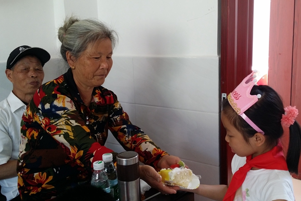 在“感恩亲人”联欢活动里,留守的孩子们将蛋糕送给辛苦照顾自己的爷爷奶奶,向他们说:“爷爷(奶奶),您辛苦了!”,有的小朋友还现场为爷爷奶奶表演节目以表达谢意。