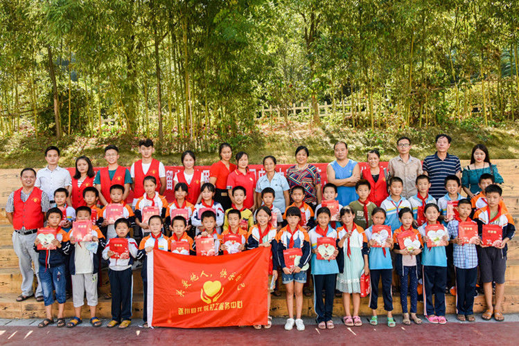 社工和志愿者为碧洲中心小学30余名留守(贫困)儿童开展了一系列有趣且有意义的活动。首先进行的是“钻呼啦圈”游戏,孩子们积极参加,在社工和志愿者耐心引导下,孩子们在互动中越来越有默契,纷纷挥舞国旗为自己的队友激情呐喊助威。随后,孩子们通过在铅画纸上画画和写寄语的形式,表达内心对远方父母的思念及祝愿之情。之后,社工结合留守儿童食品安全案例讲解食品安全知识,引导孩子们科学合理的膳食,孩子们认真聆听后,内心感触很深刻,表示将改掉自己的一些不良饮食习惯;最后,义工分别为每个孩子赠送了当地特色美味的月饼,孩子们脸上洋溢着欢乐的笑容。合影留念后,孩子们依依不舍的和义工们道别。