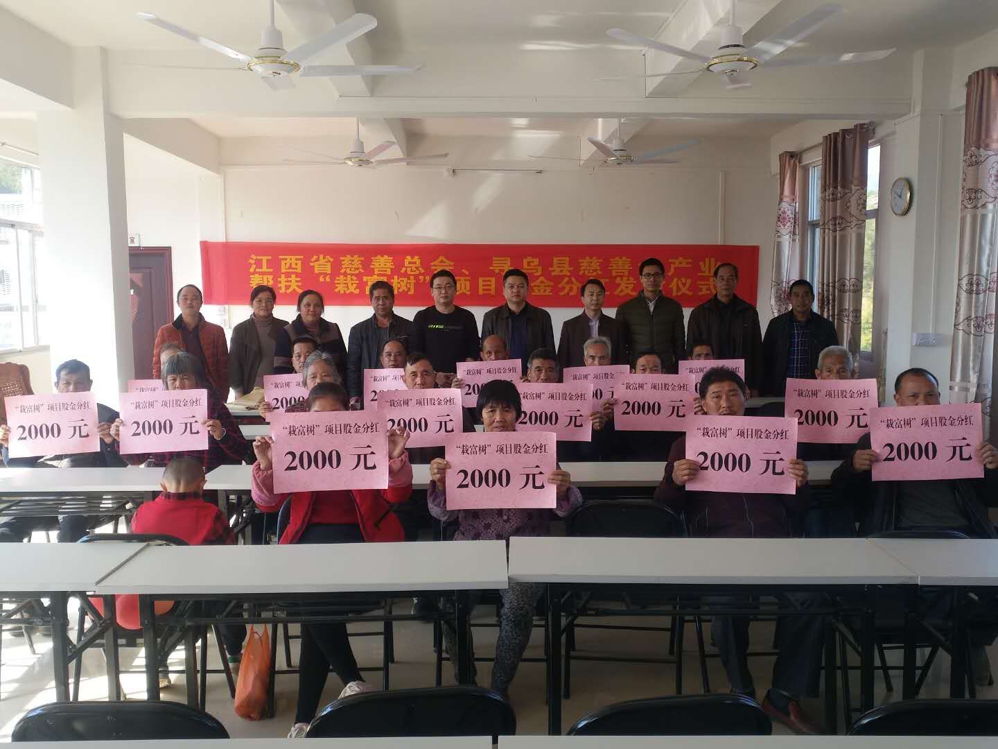 12月29日,寻乌县民政局领导、慈善会工作人员以及江西颖川堂绿色食品有限公司代表给三标乡堆禾村、留车镇水背村、晨光镇溪尾村的“栽富树”项目受益群众每户送去2000元的股金分红,这标志着“栽富树”项目在寻乌县结出了第一批硕果。