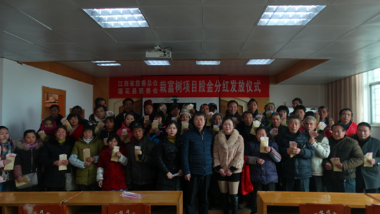 2018年2月1日,彩运网、莲花县慈善会产业扶贫“栽富树”项目股金分红发放仪式在莲花县民政局七楼大会议室举行。莲花县湖上乡凡家村30户、良坊镇白沙村20户、南岭乡长埠村50户建档立卡贫困户参加了发放仪式,在现场领取了莲和农业专业合作社联合社、多盛农林有限公司600-1200元不等的股金分红。