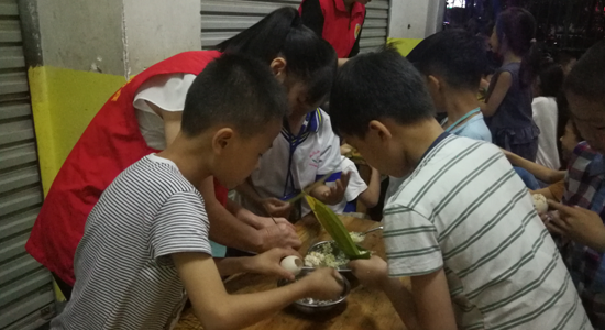 一大早,志愿者们带着浸泡好的糯米,来到孩子们中间,教他们包粽子。志愿者刘虹说道:“我们志愿者和孩子们一起包粽子欢度佳节,希望他们在动手实践过程中,既能认识到中国的传统文化,又能感受到社会大家庭给予他们的温暖和亲情,能够健康快乐的成长。”