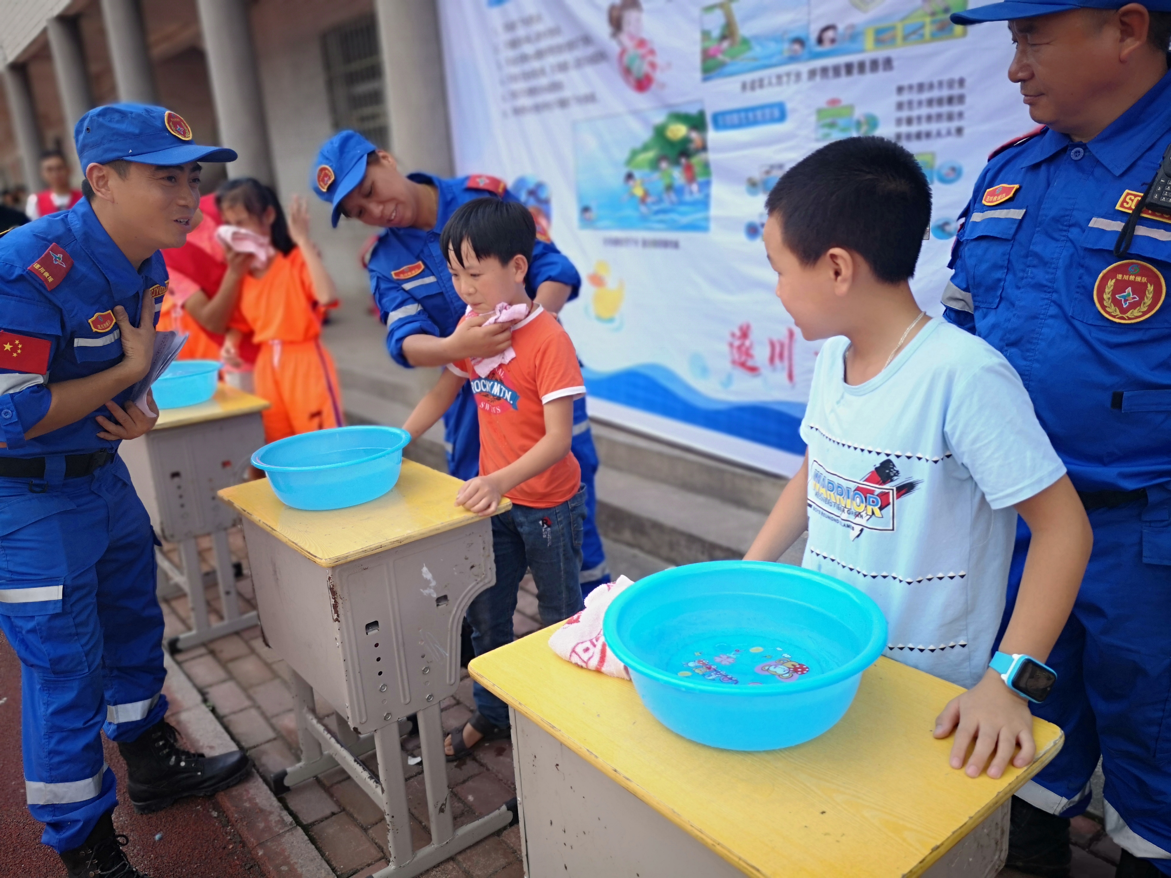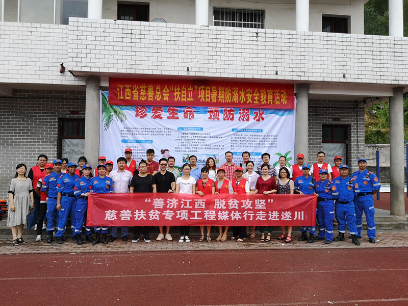 7月10日一早,记者们匆匆吃过早饭,就赶往戴家埔乡。这是江西境内较为偏远的一个乡。记者们克服晕车等不适,在山路上颠簸了近2个小时,终于抵达戴家埔中心小学。省慈善总会“扶自立”项目承接方遂川龙泉社工服务中心正在开展留守儿童夏季防溺水安全培训活动,社工老师们给孩子们传授防溺水的知识,遂川救援队队员现场指导与演练,给孩子们上了一堂既严肃又生动的安全教育课。