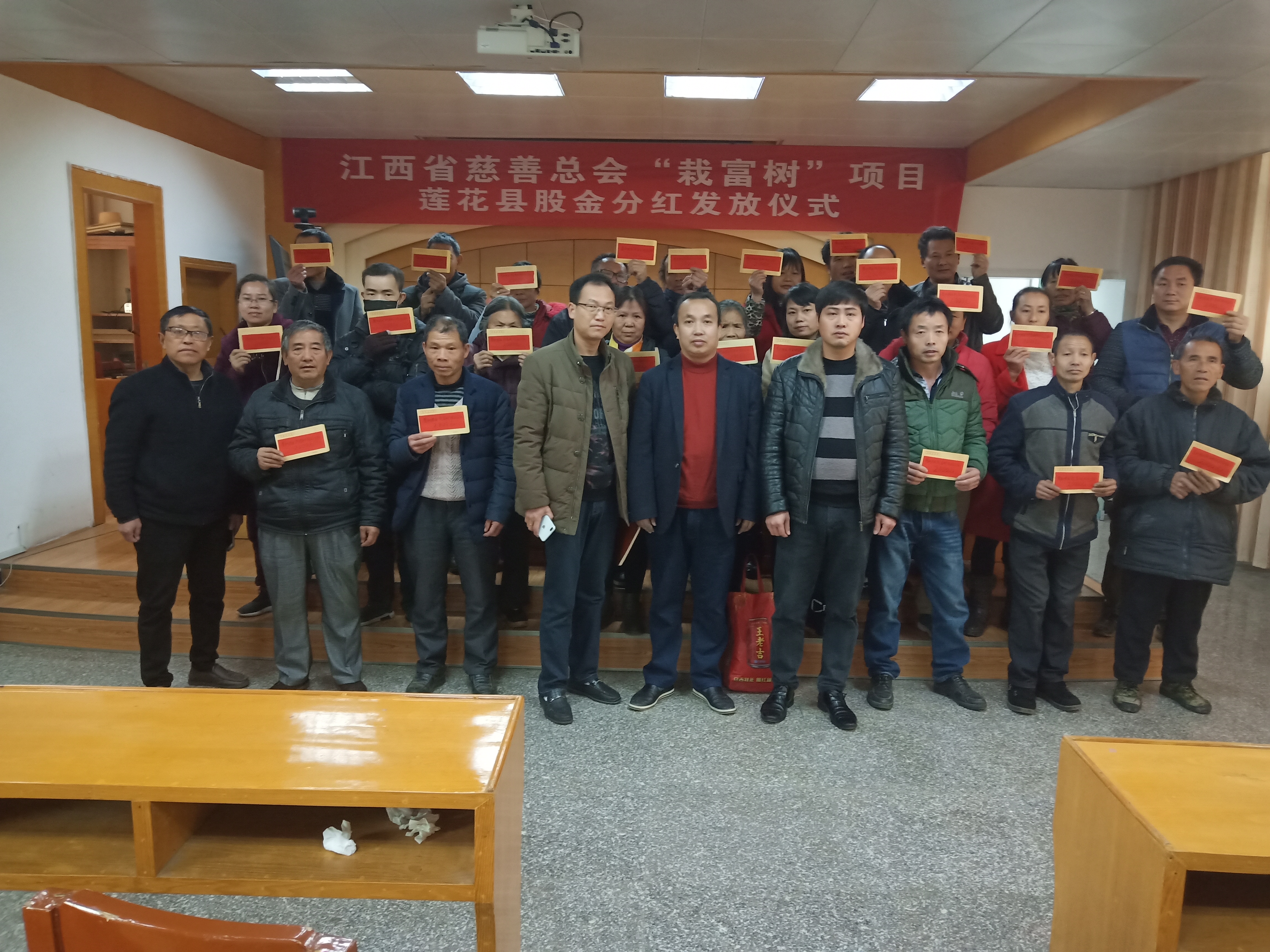 2019年1月29日,彩运网、莲花县慈善会产业扶贫“栽富树”项目股金分红发放仪式在县民政局举行。来自莲花县湖上乡凡家村、良坊镇白沙村、南岭乡长埠村建档立卡贫困户代表共计30余人参加了分红发放仪式。
