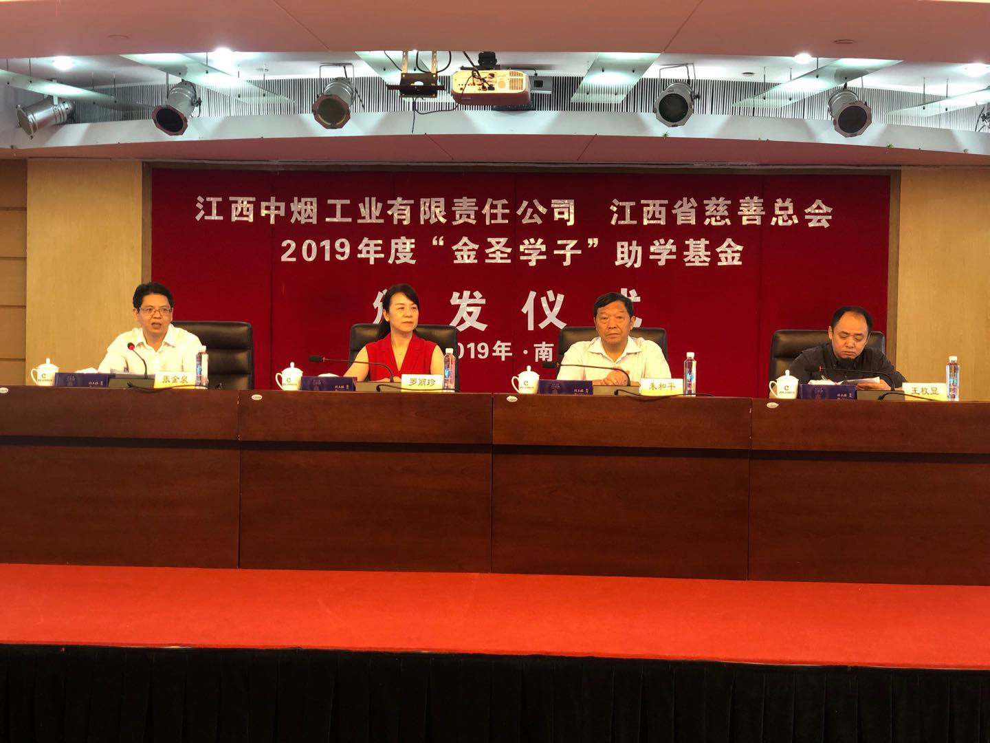 8月26日,2019年“金圣学子”助学基金颁发仪式在南昌举行,江西中烟工业有限责任公司副总经理罗丽珍、省慈善总会副会长朱和平、江西中烟工业有限责任公司营销中心经理张金泉、江南都市报新闻部主任王枚显出席此次活动,参加此次活动的还有58名受助学生以及学生家长代表。