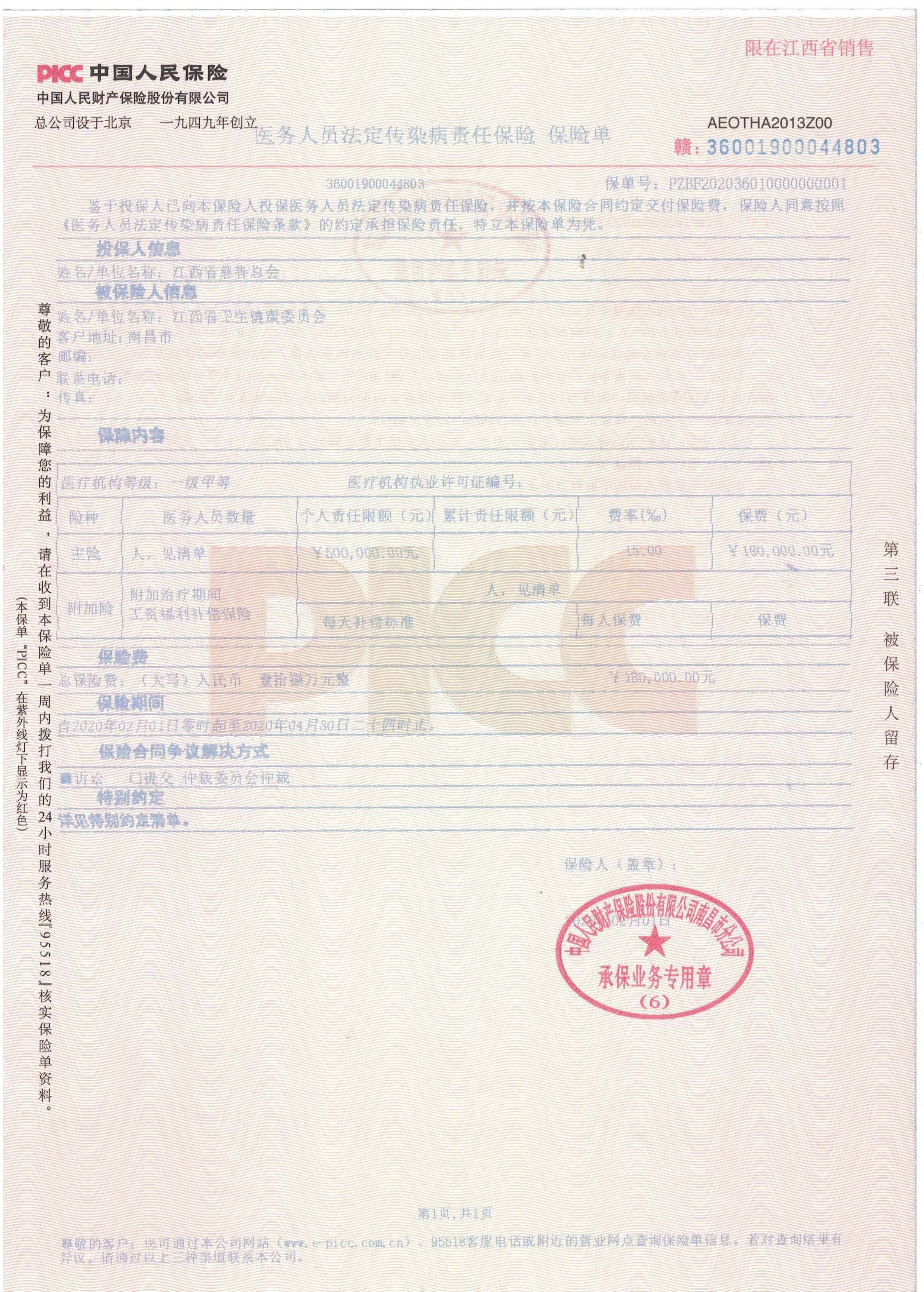 你在前方奋战,我在后方保障。为保障奋战在抗击肺炎疫情防控一线的全省医护人员人身安全,解除他们的后顾之忧,支持我省打赢疫情防控阻击战,2月1日,中国人保财险江西省分公司向省慈善总会捐赠保险产品,为首批赴武汉支援的138名医护人员、全省15000名参与肺炎疫情救治的医护人员及家庭成员捐赠每人50万保险保障,给医护人员送去一份爱心呵护,助力他们全身心投入疫情防控阻击战。