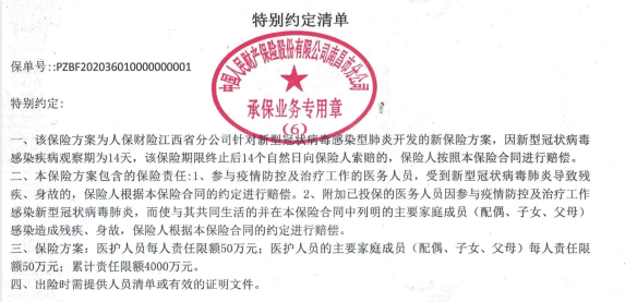据了解,自武汉市发生新型冠状病毒感染的肺炎疫情以来,中国人保财险江西省分公司高度重视,迅速反应,坚决贯彻落实省委、省政府及上级公司部署要求,积极践行国有保险企业责任,主动投身疫情防控工作,从保险保障、物资捐赠、理赔服务等多方面着手,全面助力疫情防控和救治工作,切实履行“人民保险 服务人民”的庄严使命。该保险产品对全省参与疫情防控的医护人员及家属因抗击疫情而确诊患新型冠状病毒感染的肺炎导致身故或残疾的,人保财险将向每名医护人员或其家属提供50万元的救助金。