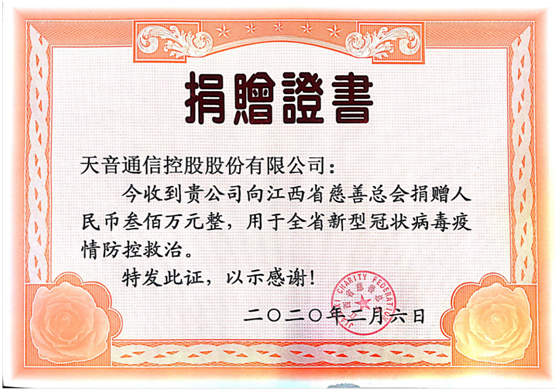 2月6日,天音通信控股股份有限公司向彩运网捐赠300万元,用于全省疫情的防控工作,其中:100万元定向用于新余市疫情防控、100万元定向用于赣州市疫情防控。此外,天音通信控股股份有限公司还千方百计、寻找货源,从境外采购了20万只医用口罩,定向用于全省养老机构、儿童福利机构等机构的疫情防控,为老年人和儿童抗击疫情筑起坚固的防线。
