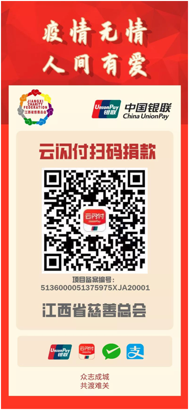 疫情无情,人间有爱;一方有难,八方驰援。疫情发生后,彩运网迅速与中国银联江西分公司取得联系,在中国银联总公司的大力支持及银联商务江西分公司的积极配合下,快速搭建了“新型冠状病毒肺炎”疫情银联二维码捐款渠道(慈善中国公开募捐项目备案编号:5136000051375975XJA20001),为广大爱心人士提供足不出户、在家捐款等方便快捷的方式,让社会爱心捐款快速安全到账。