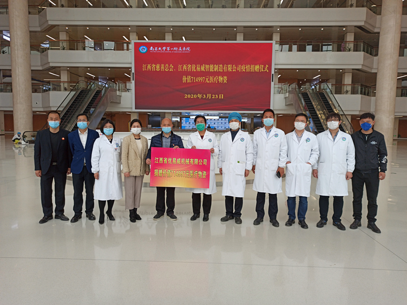 3月23日,江西优易威机械有限公司向省慈善总会捐赠医疗设备捐赠仪式在南昌大学第一附属医院象湖院区举行,南昌大学第一附属医院院长张伟、副院长陈志平,省慈善总会副秘书长胡燕,江西红海力能源科技有限公司董事长陈红球、江西优易威机械有限公司优易威公司董事长陈志云、总经理尹立森等参加捐赠仪式。
