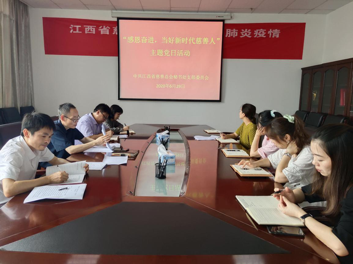 6月29日,秘书处党支部召开支部党员大会,全体党员干部参加。大家认真学习了习近平总书记在两会期间的重要讲话精神、习近平总书记视察江西重要讲话精神和对民政工作重要指示批示精神、李克强总理所作的政府工作报告、《中华人民共和国民法典》、全国人民代表大会关于建立健全香港特别行政区维护国家安全的法律制度和执行机制的决定等,并观看了专题片。秘书处党员同志上了专题党课《在战“疫”中展现慈善人的政治担当》,讲述了秘书处党支部党员干部在抗击新冠肺炎疫情中所做的工作,取得的成效及感人的故事,进一步激发了单位党员干部做好慈善工作的责任和担当。两名党员做交流发言,他们结合学习两会精神,结合新时代慈善事业发展面临的新形势及本职工作,谈体会、谈感想、谈不足、谈措施。秘书处党支部负责同志对专题学习情况进行了点评。
