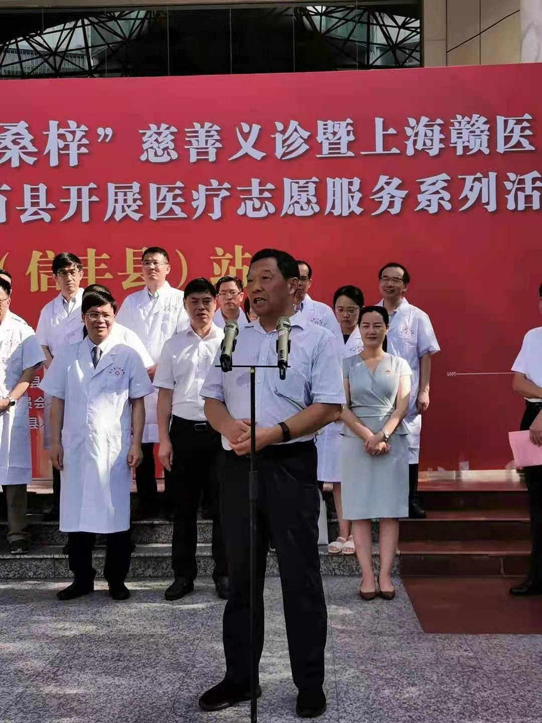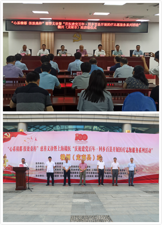 2021年7月24日-25日,省慈善总会在省卫健委的指导下,联合江西省驻沪办,在赣州市龙南、定南、信丰、全南等地开展“心系赣鄱 报效桑梓”慈善义诊暨“庆祝建党百年·回乡百县开展医疗志愿服务活动”。省慈善总会副会长蔡社宝、朱和平分别参加各地义诊启动仪式并讲话。