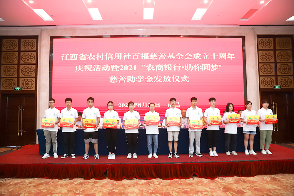 2011年,江西省联社发起成立了全省首家非公募慈善基金会——百福慈善基金会,基金会以“帮困助学,奉献社会”为宗旨,在助力脱贫攻坚、促进教育公平、服务青少年发展、传播社会正能量、抗击灾情等方面积极作为。基金会连续11年开展公益助学活动,每年对省内品学兼优的困难学生进行资助,并开展了援建希望小学、儿童数字图书馆、SOS儿童村等多个慈善项目,至今已累计捐款超过1.2亿元,资助了5.5 万余名困难学子就学升学,积极履行了全省农商银行的社会责任和大行担当。
