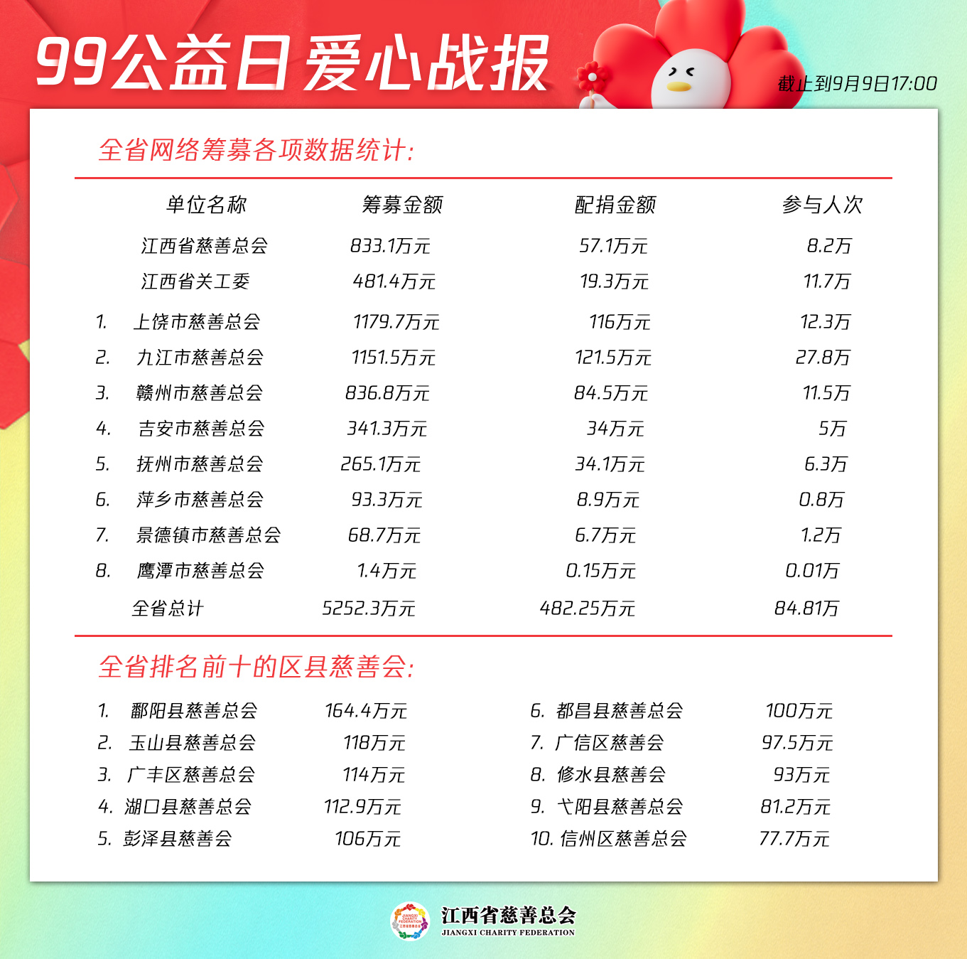 截止到9月9日17点整,省慈善总会本级募款金额突破800万元,较去年增长21%。全省慈善会系统募捐善款共计5252.3万元,较去年增长73%;获得配捐金额482.2万元,较去年增长112%;参与人数84.8万人次,较去年增长40%。