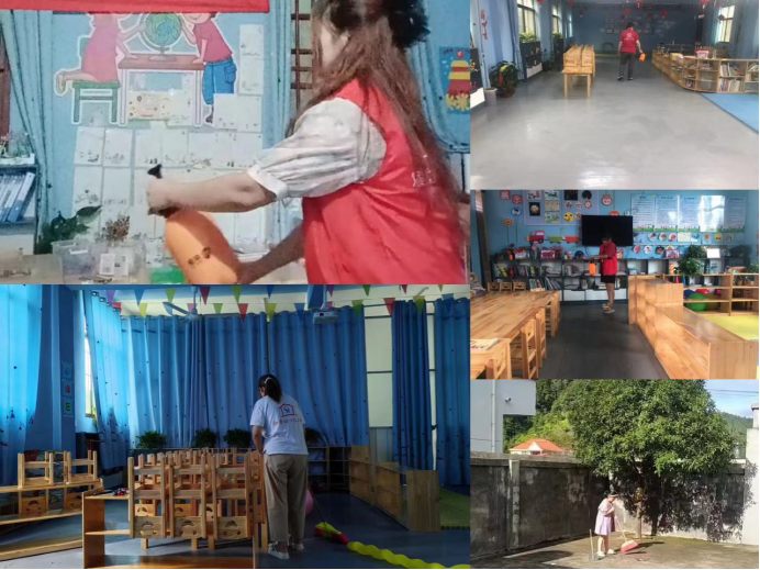 万安县各项目村“少儿之家”守护员在打扫和消毒
