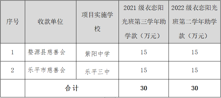 2021-2022年衣恋集团捐资在我省婺源县紫阳中学、乐平市第三中学各开设两个“慈善阳光班”,资助200名困难家庭高中学顺利完成高中三年学年,每名学生每学年发放助学金3000元,2023年下半年共发放助学金60万元(详细情况见附件)。
