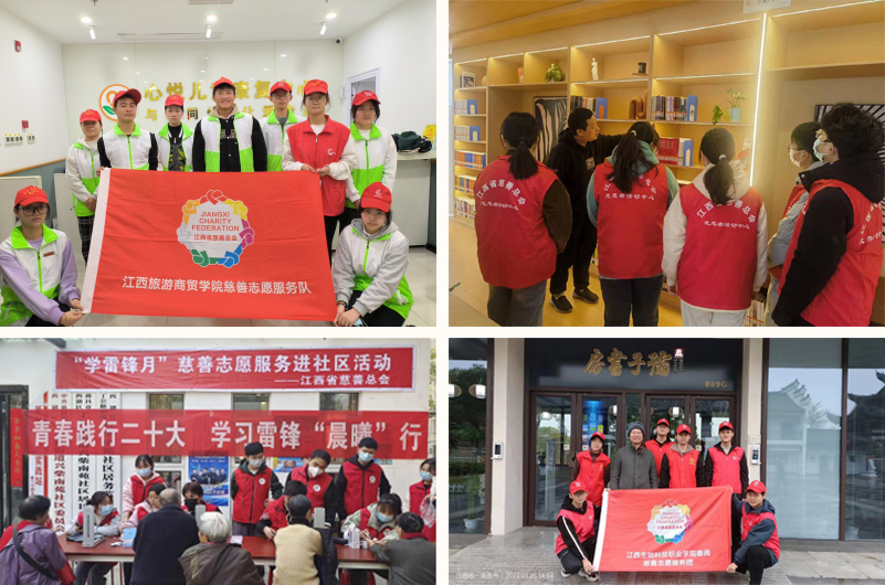 省慈善总会志愿者活动中心组织华东交通大学爱心社慈善志愿服务队、江西中医药大学晨曦慈善志愿服务团、江西现代职业技术学院爱行天下慈善志愿服务团、江西生物科技职业学院春雨慈善志愿服务团、江西旅游商贸职业学院慈善志愿服务队、南昌晚报小记者慈善志愿服务团等6支慈善志愿服务团队、120余名志愿者参与孺子书房全民阅读公共服务。江西中医药大学晨曦慈善志愿服务团走进南昌市西湖区丁公路街道兴柴南苑社区开展志愿服务活动,为居民提供测量血压血糖等基础护理和中医推拿、艾灸体验等特色卫生健康志愿服务。江西旅游商贸学院慈善志愿服务队来到南昌市青山湖区心悦儿童康复中心看望患有孤独症的儿童,用实际行动呼吁更多人关注孤独症患者这个特殊群体,并给与更多的理解和帮助。