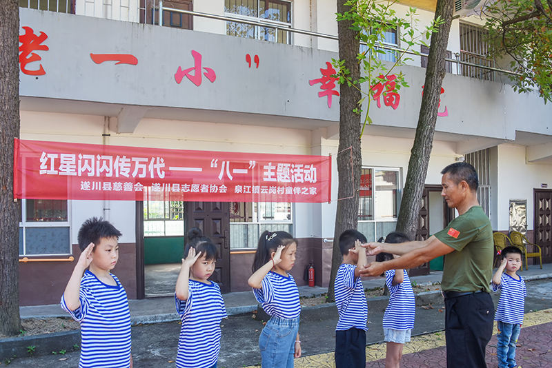 7月30日,遂川县慈善会联合遂川志愿者协会在泉江镇云岗村“一老一小”幸福院开展“红星闪闪传万代 幸福院里庆‘八一’”主题活动。