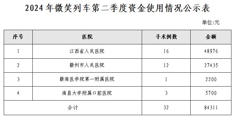 2024年2季度“微笑列车”项目,我省共救助困难家庭唇腭裂患者32人,支付中华慈善总会定向捐助款84311元,资金已拨付至江西省人民医院、南昌大学附属口腔医院等4家医院,具体资金拨付明细见公示表。