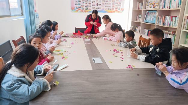 石境村童伴妈妈带领着孩子们去户外收集落叶及花朵,感受大自然的魅力。孩子们一路上唱着跳着,像一群欢快的小鸟,他们在树林里、草地上捡起各式各样的落叶,手足舞蹈地说“老师你看,我的树叶像个爱心!”“老师,我最喜欢这一片落叶,像一条小鱼,可爱极了!”每个孩子都无比开心。回到活动室,孩子们挑选样本,小心翼翼地在纸上粘贴,发挥创意。有的制作海底世界,有的描绘大树与动物家园,还有的展现冬日风景。童伴妈妈穿梭其间,给予指导与鼓励。