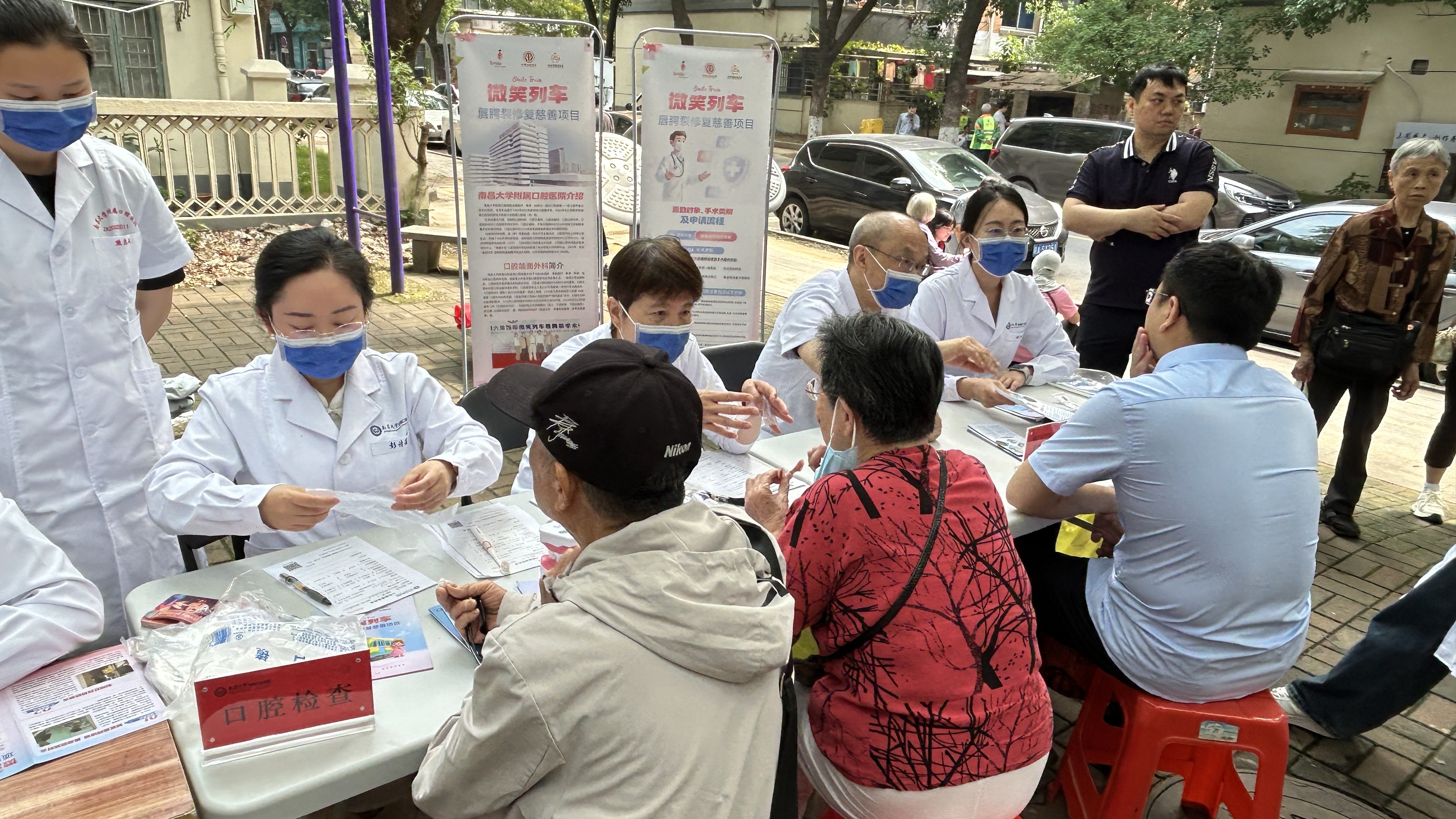 在江西省儿童医院义诊活动现场,医护人员耐心地为每一位患儿进行细致评估,不仅精准测量唇腭裂的畸形程度,还对口腔功能、营养状况等健康维度进行立体式检查。在南昌市东湖区省府大院二社区,南昌大学附属口腔医院的专家团队化身“政策讲解员”,从手术流程到术后护理,从医保报销细则到“微笑列车”项目的慈善救助政策,事无巨细地为社区居民答疑解惑。针对居民提出的口腔问题,医生们还进行了现场检查和护理指导,用实际行动将健康服务送到群众家门口。