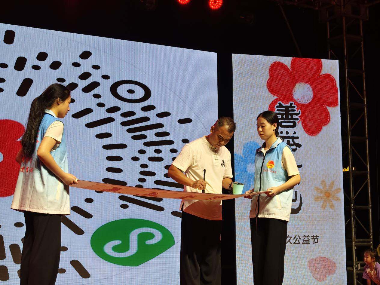 晚会不仅是情感的共鸣,更是行动的号召。活动现场,宜春市慈善总会通过生动的视频短片和现场讲述,让大家深入了解了“薪火共益计划之‘车轮上的守护’——关爱三轮车师傅”公益项目,大家深刻感受到一线劳动者的辛劳与不易。在随后的公益拍卖环节,宜春市著名书法家汤青云先生捐赠的4幅书法作品成为全场焦点,其深厚的艺术造诣与无私的奉献精神,深深打动了在场的爱心企业和市民。经过多轮热烈竞拍,作品募集的善款将全部用于为三轮车师傅配备防暑降温和安全防护物资。晚会还开通了便捷的线上募捐渠道,市民们纷纷掏出手机,扫码捐赠,用指尖传递爱心,以实际行动支持“薪火共益计划”。