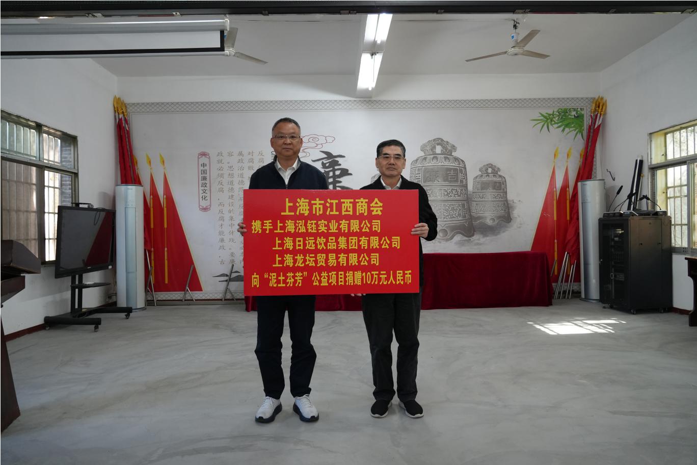 10万元,由上海市江西商会携手上海泓钰实业有限公司、上海日远饮品集团有限公司及上海龙坛贸易有限公司共同捐赠。上海市江西商会执行会长、上海泓钰实业有限公司董事长罗国庆作为捐方代表发言,他表示,慈善不是简单的物质馈赠,而是文明火种的传递,未来,上海市江西商会将大力支持“泥土芬芳”公益项目,继续开展更多暖人心、强信心、减民忧的慈善项目。