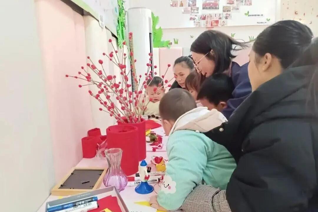 活动以“桔”与“福”为主题。在“桔子贴福”区,孩子们专注地握笔,在红纸上描红“福”“平安”等字词,或画上可爱笑脸,家长在一旁温柔引导,协助剪裁、粘贴。当满载祝福的红纸贴上金黄砂糖橘,孩子们高举“吉祥桔”,脸上绽放出巨大的笑容。另一侧的“福桶”制作区热闹非凡。孩子们努力将干树枝插稳,小心翼翼挂上描红福字和红色爱心。在家长“宝贝,挂在这里真棒”的鼓励声中,一个个红火精致的福桶随之完成,活动室仿佛被点亮,洋溢着满满的喜悦。