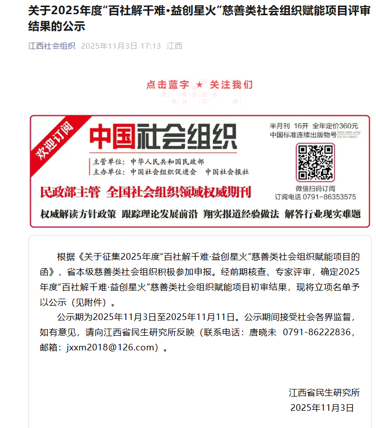 11月27日,江西省民生研究所在南昌组织举办了“百社解千难?益创星火”慈善类社会组织赋能项目专题培训(第一期),一对一向立项单位提供全方位咨询,培训会后集中拨付项目配套资金。本次培训聚焦慈善类社会组织发展痛点与需求,精心设置三大核心课程模块:围绕“新时代慈善组织的战略规划与运营实践”,助力学员开阔视野、明晰组织定位、构建发展蓝图;解读“金融服务公益慈善行业现状”,普及金融通识,强化风险防范意识,为慈善项目资金安全和规范运作筑牢“防火墙”;以“智守财富,穿越周期”为主题,引导学员探索慈善资产合规管理与保值增值路径,为慈善事业打造稳定可持续的“蓄水池”和“动力源”。