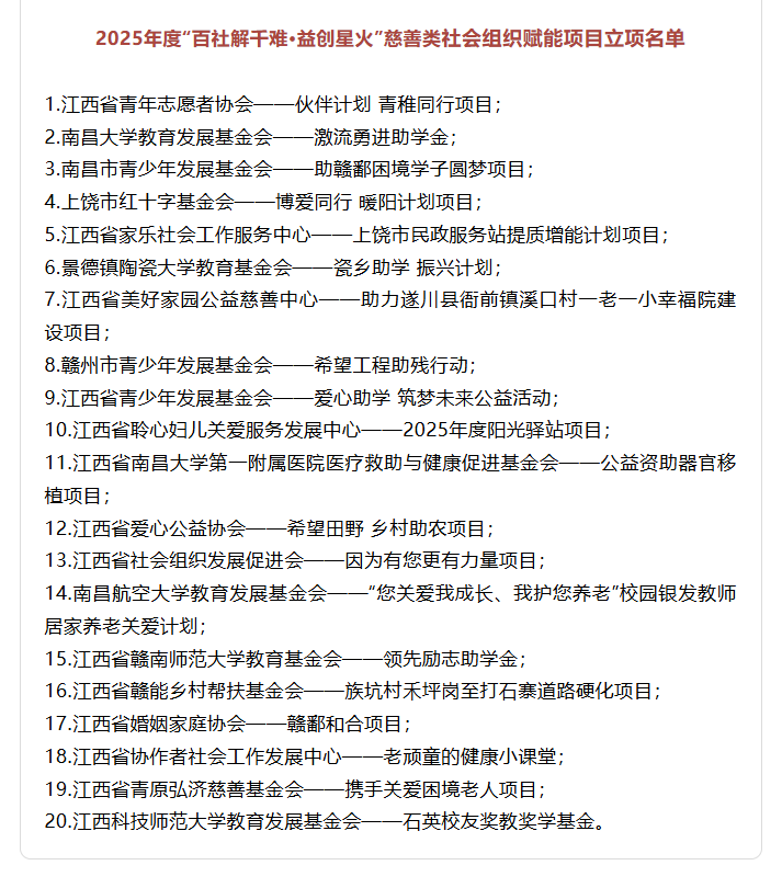 委托江西省民生研究所进行慈善类社会组织赋能项目的征集,开展项目评审;举办专题培训班对接项目需求,对立项单位提供全方位咨询;支付项目配套资金。